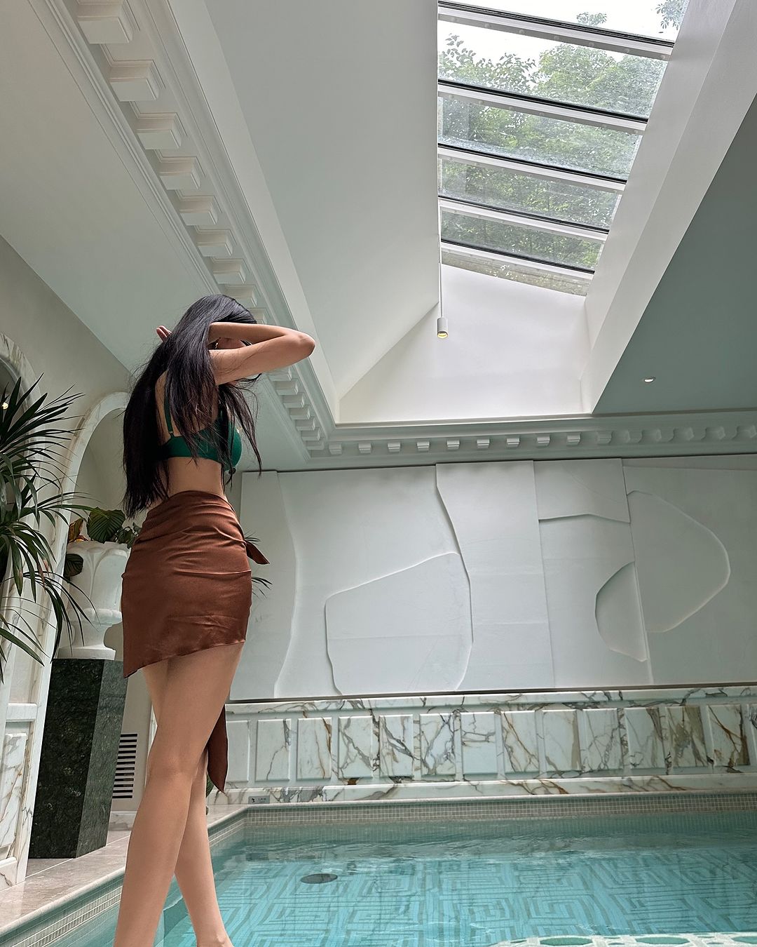 효민은 큰 검은색 선글라스를 착용해 스타일리시한 포인트를 주었고, 흰색 슬리퍼를 선택해 편안함과 실용성을 강조했습니다. 이러한 소품들은 수영장이나 해변에서 잘 어울리는 아이템으로, 효민의 전체적인 룩에 자연스러움을 더해줍니다. 그녀가 서 있는 배경은 대리석으로 장식된 아치형 문과 수영장으로, 고급스러운 분위기를 자아내며 비키니 룩과 완벽한 조화를 이룹니다.